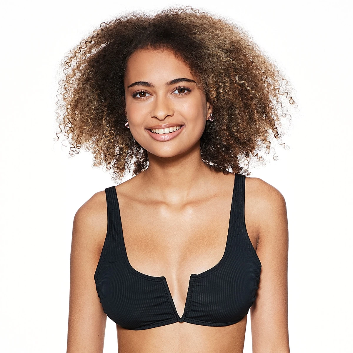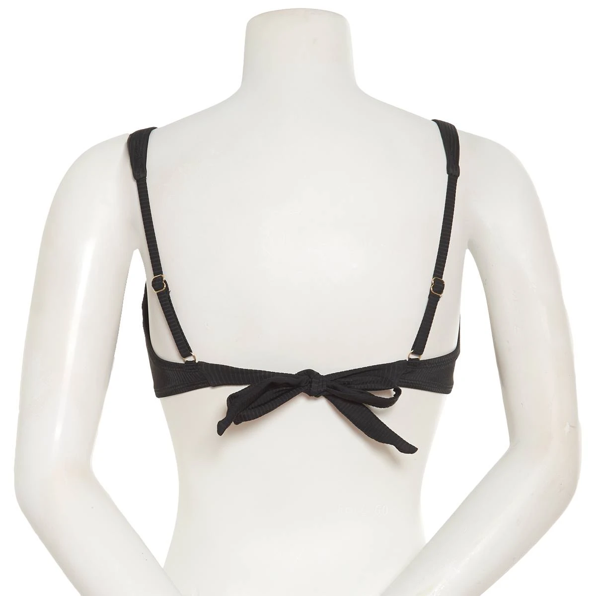 Get ready for summer with the Juniors California Sunshine rib swim top. This solid bikini top includes removable pads, adjustable straps, a v-wire front, and a tie back.