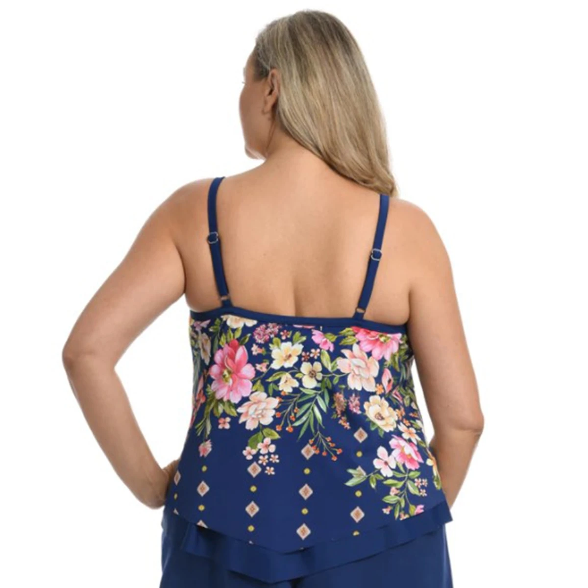 Simply stunning, this Plus Size Maxine border palms over the shoulder flutter tankini swim top pairs a field of gorgeous blooms with geometric motifs for undeniable style. Built-in cups and adjustable straps provide just-right support, while a flattering flutter hem softens the silhouette.