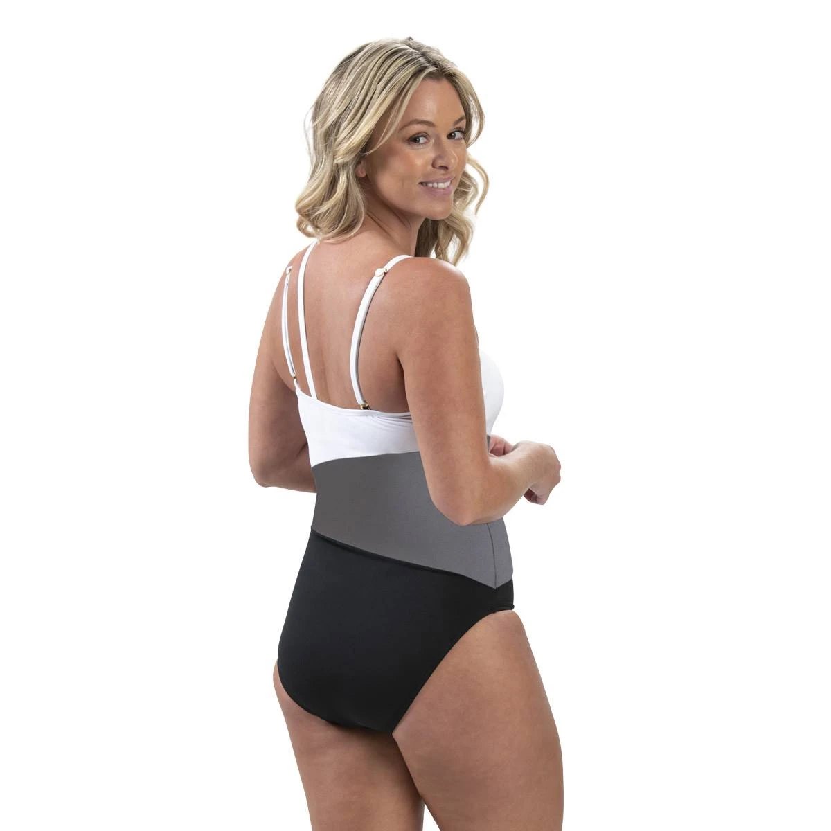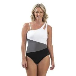 Classic with a twist, this Womens Dolfin® Aquashape color block asymmetrical one piece swimsuit is ready for action! Water-ready, the swimsuit features a keyhole on the left strap and a removable right strap.