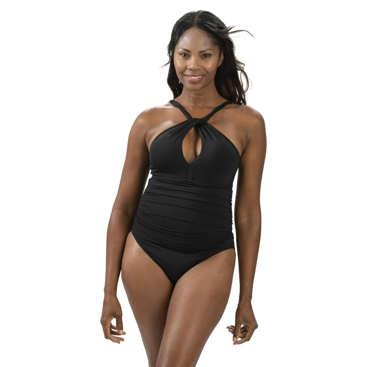 WOW! This Womens Dolfin® Aquashape solid contemporary one piece swimsuit is gorgeous and full of life, just like you! With a center front keyhole and halter neckline, this swimsuit is oh-so-ready for whatever you have planned!