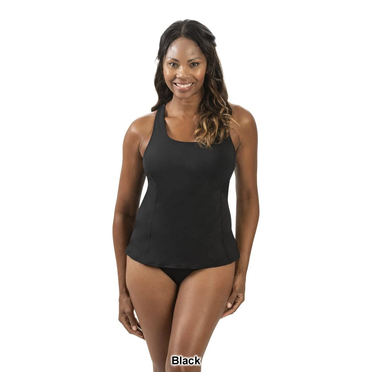 This Womens Dolfin® Aquashape tranquility solid twist back tankini swim top is simple, sweet, and ultra-practical. With a power mesh front liner for tummy control and a mastectomy-friendly build, this tankini top is perfect!